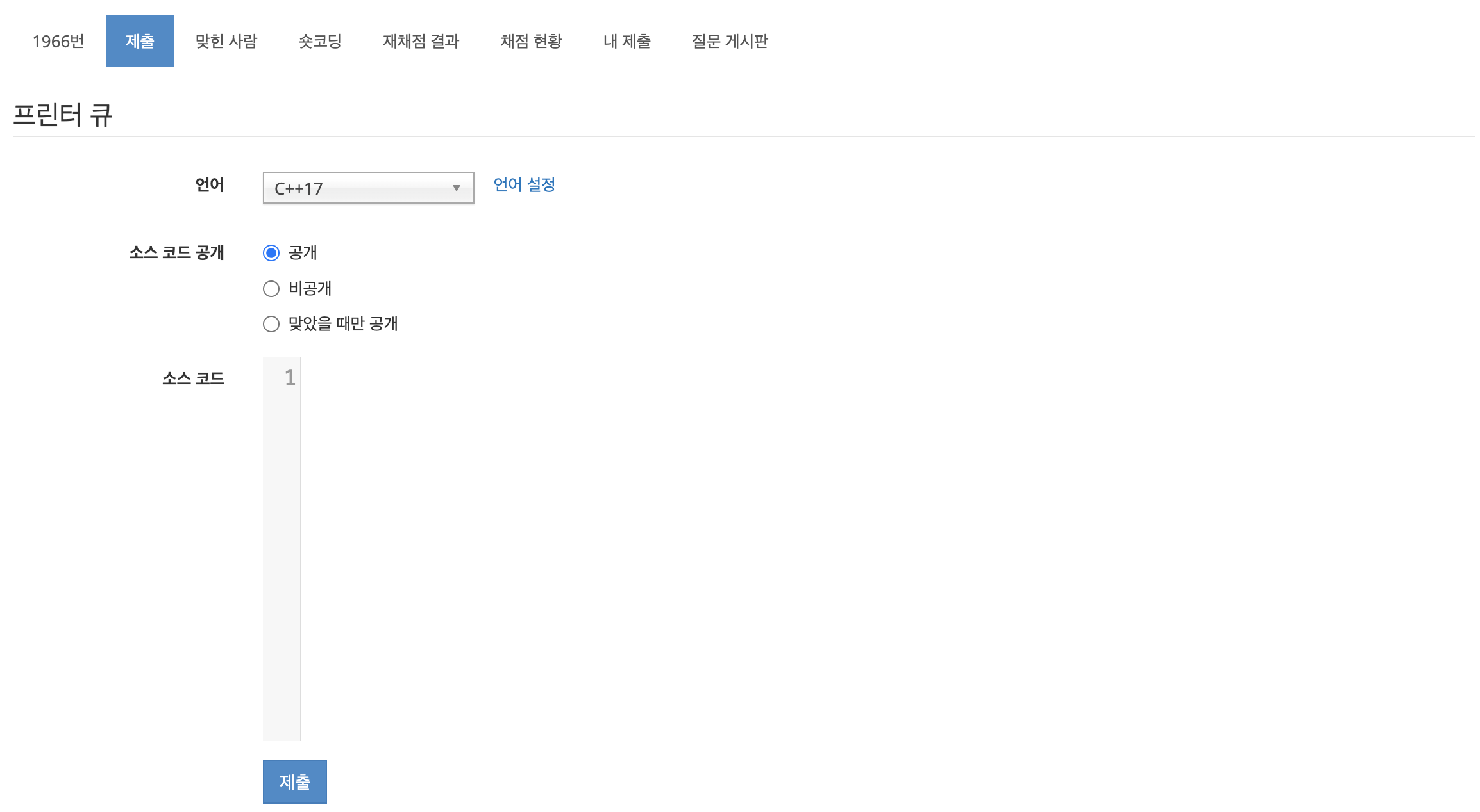 아직 풀지 않은 문제로 들어가서 문제를 읽고, '제출'을 누르면 코드를 제출할 수 있는 화면이 나타납니다.
