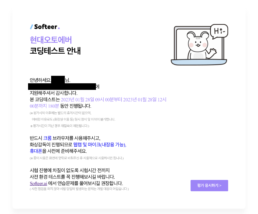 모든 계열사가 그런지는 모르겠지만 최근 들어 현대 코딩테스트는 softeer 라는 자사 코딩테스트 플랫폼을 이용하고 있고, 서류 발표 전에 실시하고 있다고 합니다.