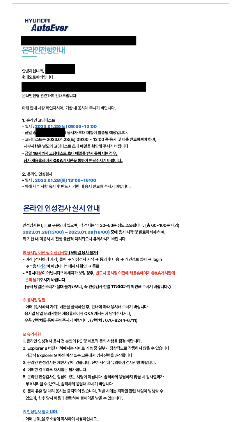 코딩테스트와 인성검사는 메일 수신한 날로부터 8일 뒤의 일정이었고 인성검사 또한 같은 날에 이뤄진다는 내용이었습니다. 이때까지도 사실 서류 합격을 해야 코딩테스트를 보는줄 알고 거의 준비를 하고 있지 않았습니다😂