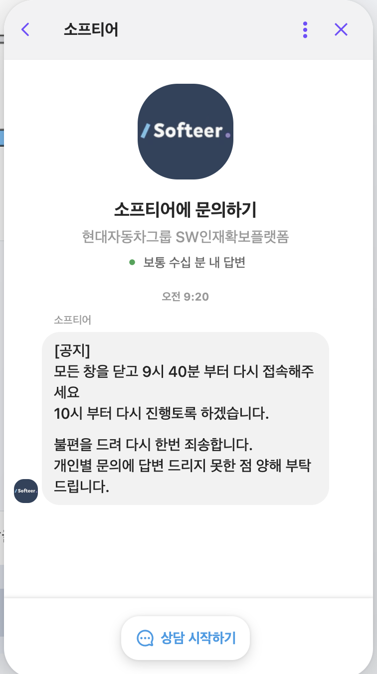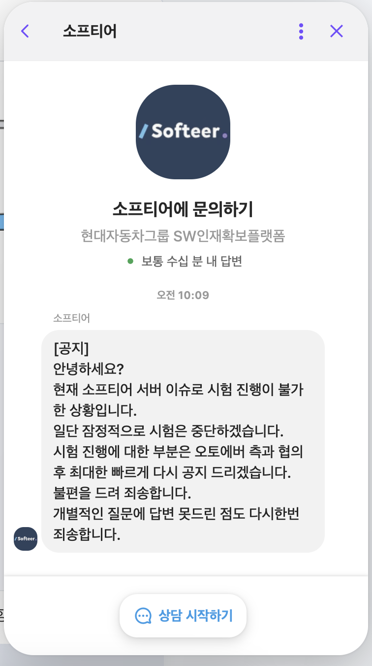 챗봇으로 문의를 남기고 기다리다 보니 서버 오류로 전체 리셋을 하겠다며 10시에 시험을 재개하겠다는 공지를 띄웁니다.