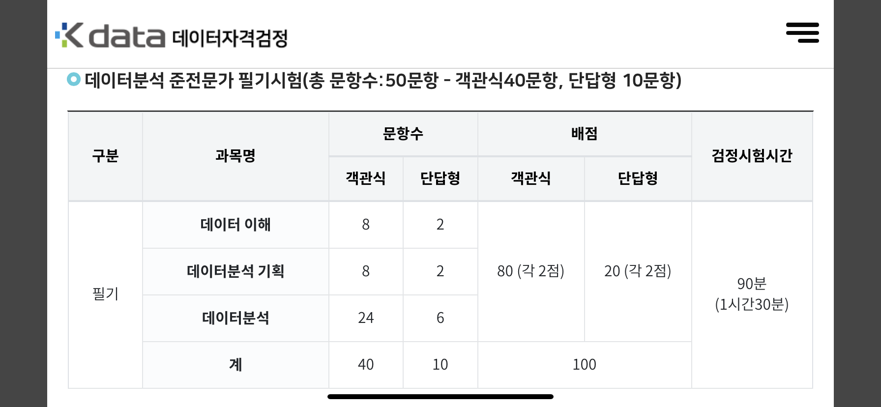 시험 시작시간은 오전 10시 이며, 총 시험 시간은 90분입니다. 과목은 총 3개이며 배점은 위 사진을 참고하시면 되겠습니다. 입실은 9시 30분까지라고 하네요!