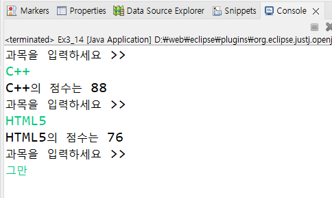 그리고 과목 이름을 입력받아 점수를 출력하는 프로그램을 작성하라. "그만"을 입력받으면 종료한다.