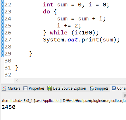 while문 안에서 2의 배수를 계속 합산해 가는 프로그램이며 i가 100이 되면 멈추고 2450이 출력된다.
