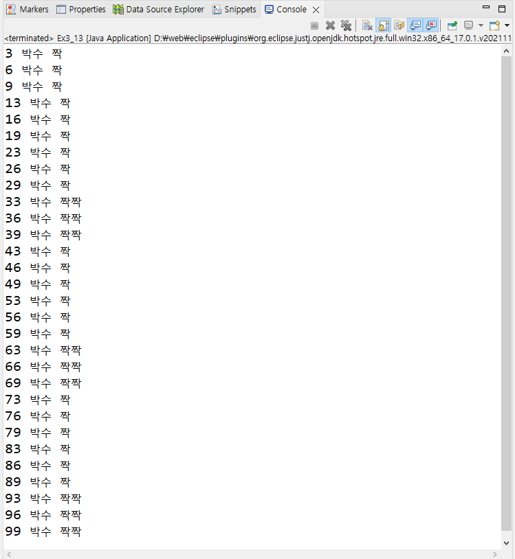 System.out.println(i+" 박수 짝");
