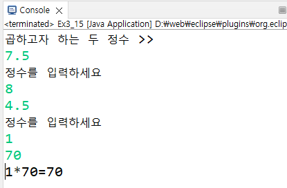2개의 정수를 입력받아 곱을 구한다. 실수가 입력되면 정수를 다시 입력하도록 하여 예외 없이 정상적으로 처리되도록 예외 처리 코드를 삽입하여 Multiply 클래스를 수정하라.