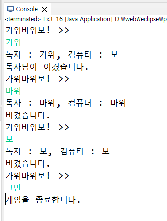 컴퓨터와 독자 사이의 가위 바위 보 게임을 만들어보자. 독자가 가위 바위 보 중 하나를 입력하고 <Enter>키를 치면 프로그램은 가위 바위 보 중에서 랜덤하게 하나를 선택하고 컴퓨터가 낸 것으로 한다. 누가 이겼는지 판단하고 독자가 "그만"을 입력하면 게임이 끝난다.