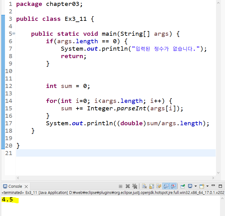 Average.java 작성하라. 명령행 인자는 모두 정수만 사용되며 정수들의 평균을 출력한다.