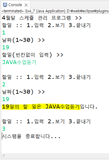 System.out.println("1.예약하기 2.조회하기 3.예약취소 4.끝내기");