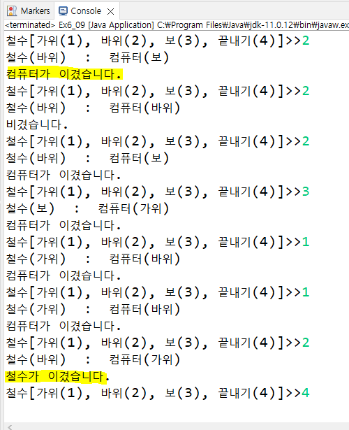 6장 실습문제 9번 : 철수와 컴퓨터의 가위바위보 게임을 만들어보자. 가위, 바위, 보는 각각 1, 2, 3 키이다. 철수가 키를 입력하면, 동시에 프로그램도 Math.Random()을 이용하여 1, 2, 3 중에 한 수를 발생시키고 이것을 컴퓨터가 낸 것으로 한다. 그런 다음 철수와 컴퓨터 중 누가 이겼는지 판별하여 승자를 출력하라.