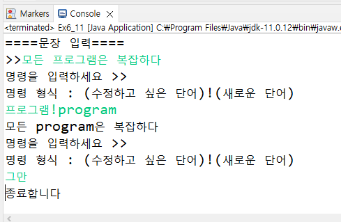 System.out.println("명령 형식 : (수정하고 싶은 단어)!(새로운 단어)");