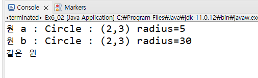 6장 실습문제 2번 : 중심을 나타내는 정수 x, y와 반지름 radius 필드를 가지는 Circle 클래스를 작성한다. 생성자는 3개의 인자(x, y, radius)를 받아 해당 필드를 초기화하고 equals() 메소드는 두 개의 Circle 객체의 중심이 같으면 같은 것으로 판별하도록 한다.