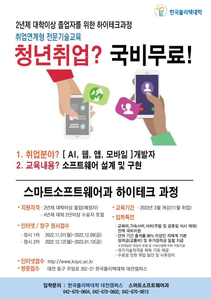 폴리텍대학의 하이테크과정은 학사학위(전문학사, 휴학생 포함)를 가지고 있는 인원을 대상으로 하는 교육과정입니다. 제가 선택한 폴리텍대학 대전캠퍼스는 소프트웨어(타대학 컴퓨터공학과) 학과를 두 가지 방법으로 모집하고 있습니다. 하나는 졸업 후 전문학사 학위를 취득할 수 있는 2년제 학위 과정이고, 하나는 위에서 설명한 하이테크 과정입니다.