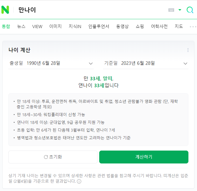 네이버에서 "만나이" 혹은 "만나이 계산기" 를 검색하면 만 나이를 손쉽게 확인할 수 있습니다~